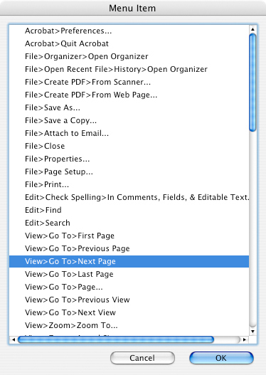 4. Add an Action. Click the Actions tab and choose Execute a menu item from the Select Action pull-down menu. Click Add and the Menu Item dialog box opens. Select View>Go To>Next Page as shown in Figure 1.