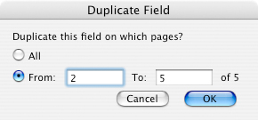10. Specify the page range. The Duplicate Field dialog box opens. Click the From radio button and type 2 in the first text box. By default, the last page in your document should appear in the second text box (see Figure 3).