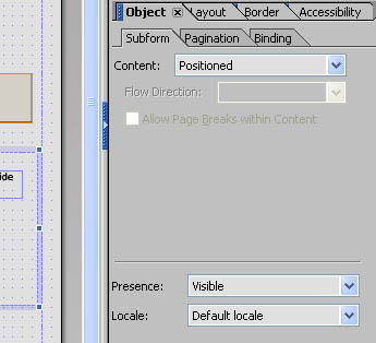 To build our LiveCycle example, start up LiveCycle Designer and create a new document. Add a regular button and a subform to the form. For the example, it doesn’t matter how they are placed. Set the caption on the button to "Button Up" and add some visible elements to the subform just so there is something in it. A static text element is fine. The default properties for both elements should work, but to be sure, each should have the following properties (Figure 3 and Figure 4):