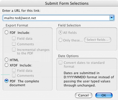 Nothing earth shattering here. Most people working with forms know how to submit a form. People who have been working with Acrobat 8 are also aware that when you click the PDF The Complete Document radio button on a form enabled with Adobe Reader usage rights, you can receive the entire PDF document submitted by an Adobe Reader user.