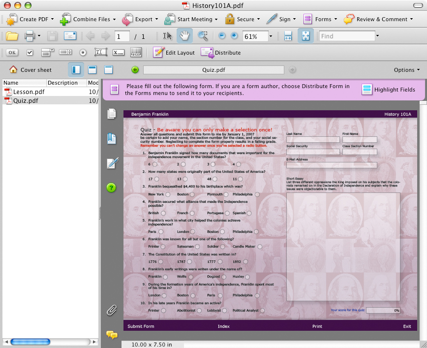 In Figure 2, you can see a PDF Package I created with the form in view in the Document pane. Another document resides in this package, as shown in the PDF Package panel. The form is a single-page document; when the Submit Form button is added to this page, only the form is submitted to the e-mail address specified in the Submit Form Selections dialog box. All the remaining files in a PDF Package are left behind.