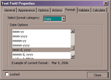 Select one of the "Date" format options. This formatting will force the user to enter the date in a specific way. To help the user along the field’s tooltip displays an example date like the one at the bottom of the Properties Dialog. As an extra measure it is also a good idea to add text somewhere on the form displaying this format as an example for the user.